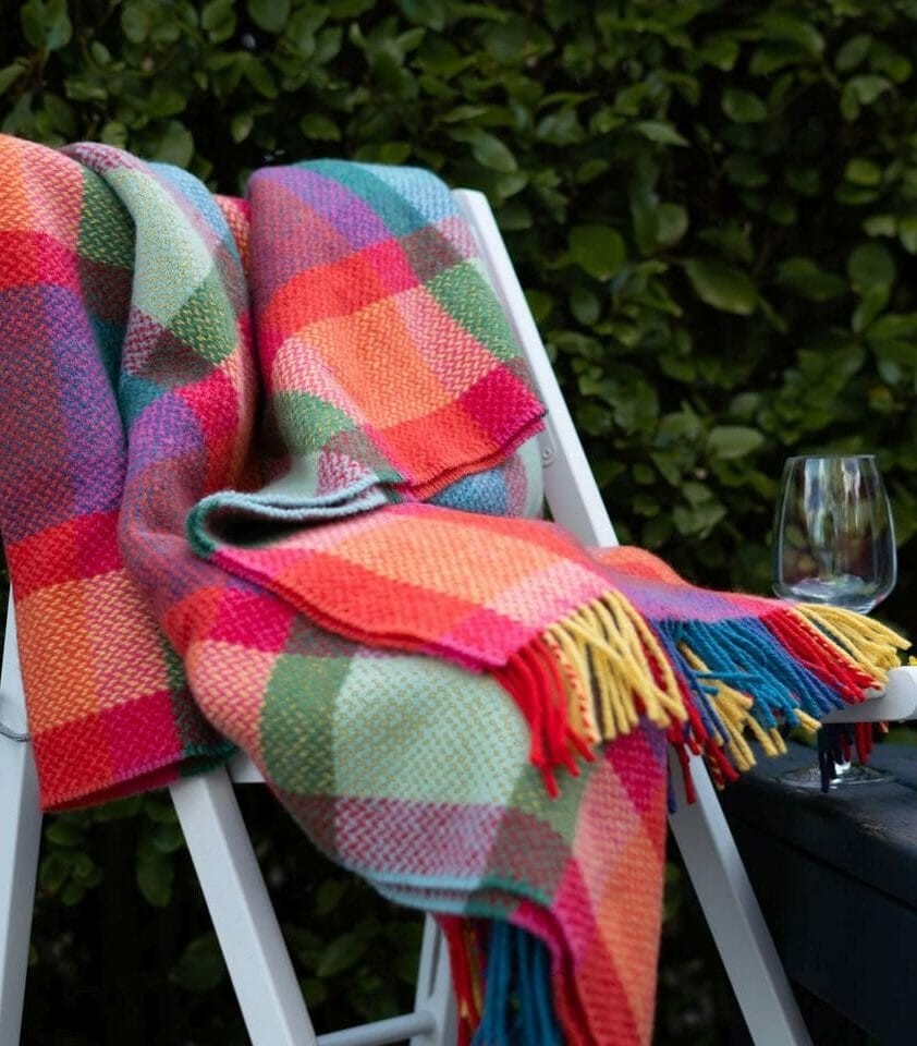 Merino Wool Cashmere Throw Bright Yellow, Pink and Green Check. Wrap yourself in luxury with our Merino Wool Cashmere Throw, expertly crafted from a blend of 95% Merino Wool and 5% Cashmere. Woven exclusively in Ireland, it offers unmatched softness and warmth, perfect for curling up on cooler evenings or adding a refined touch to your living space. Whether for personal indulgence or a thoughtful gift, the Merino Wool Cashmere Throw is a luxurious and versatile addition to any home.